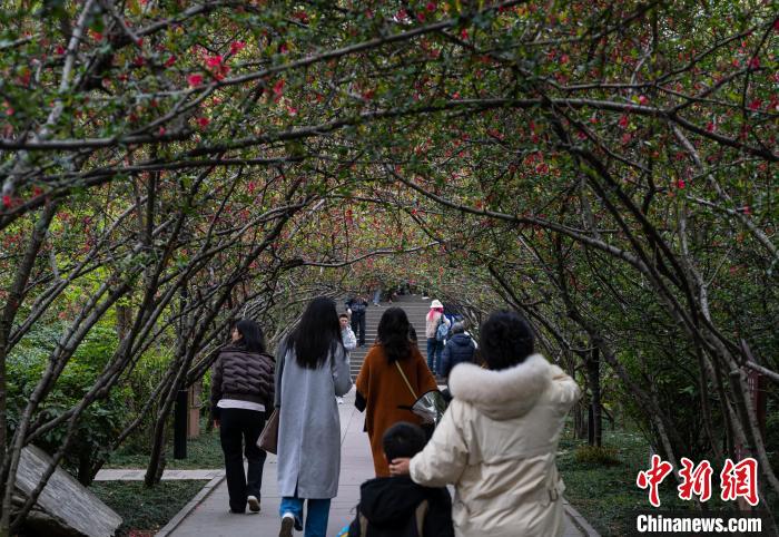 圖為3月16日,市民行走在棠湖公園內(nèi)的“海棠花道”上。韓金雨 攝