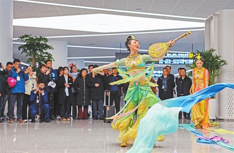 3月20日,在T3航站樓國內到達層,文藝工作者為旅客表演經(jīng)典舞劇《絲路花雨》片段。