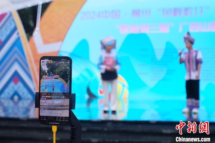 2024年4月,廣西柳州,年輕山歌手同臺對唱,線上直播吸引網(wǎng)友。(資料圖)劉俊聰 攝