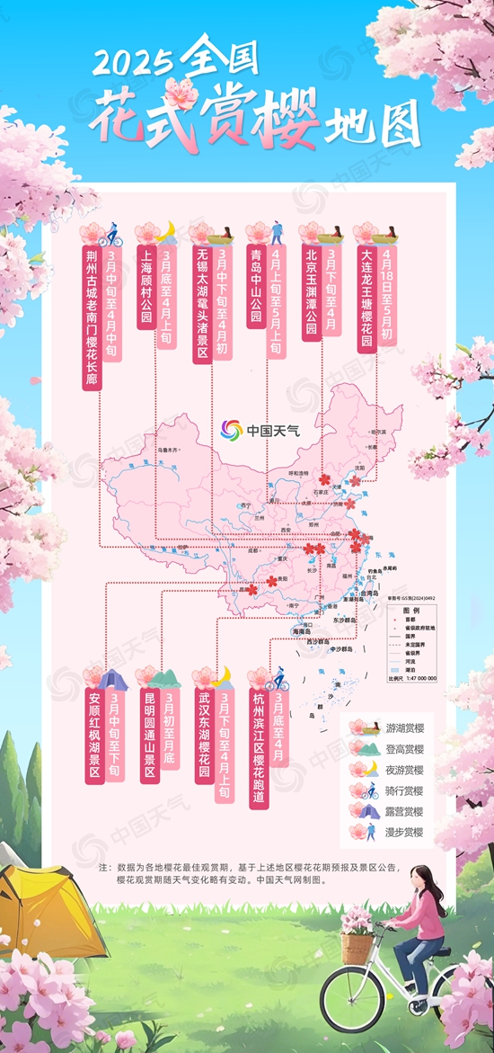春季天氣多變,冷空氣不時(shí)“刷存在感”。眼下一場(chǎng)寒潮天氣正在影響我國(guó),江南多地春雨即將上線(xiàn),北方大風(fēng)天氣頻繁,風(fēng)雨一來(lái)櫻花容易被吹落,賞花還需把握時(shí)機(jī)。南方的小伙伴不妨在寒潮到場(chǎng)前,安排一場(chǎng)夜游賞櫻,別有一番浪漫;北方的中晚櫻還未大面積開(kāi)放,小伙伴們可以等寒潮結(jié)束后將第二波賞櫻日程計(jì)劃上,別錯(cuò)過(guò)這浪漫的櫻花季。(文/江漪 設(shè)計(jì)/王維一 數(shù)據(jù)支持/孫倩倩 審核/劉文靜 余曉芬)