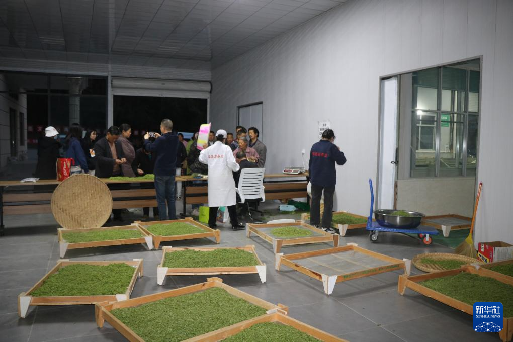 中廟鎮(zhèn)溢品茗茶葉加工廠收購(gòu)當(dāng)?shù)夭柁r(nóng)茶葉鮮葉。新華社記者李杰 攝