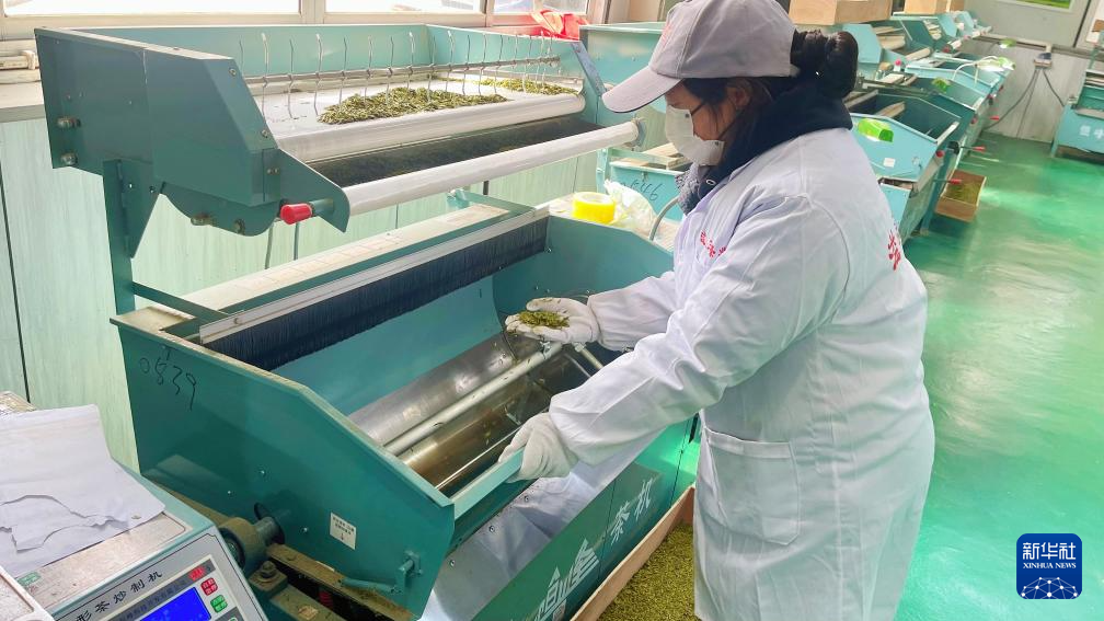文縣溢品茗茶葉種植農(nóng)民專業(yè)合作社生產(chǎn)車間負(fù)責(zé)人袁素花正在查看茶葉炒制情況。新華社記者李杰 攝