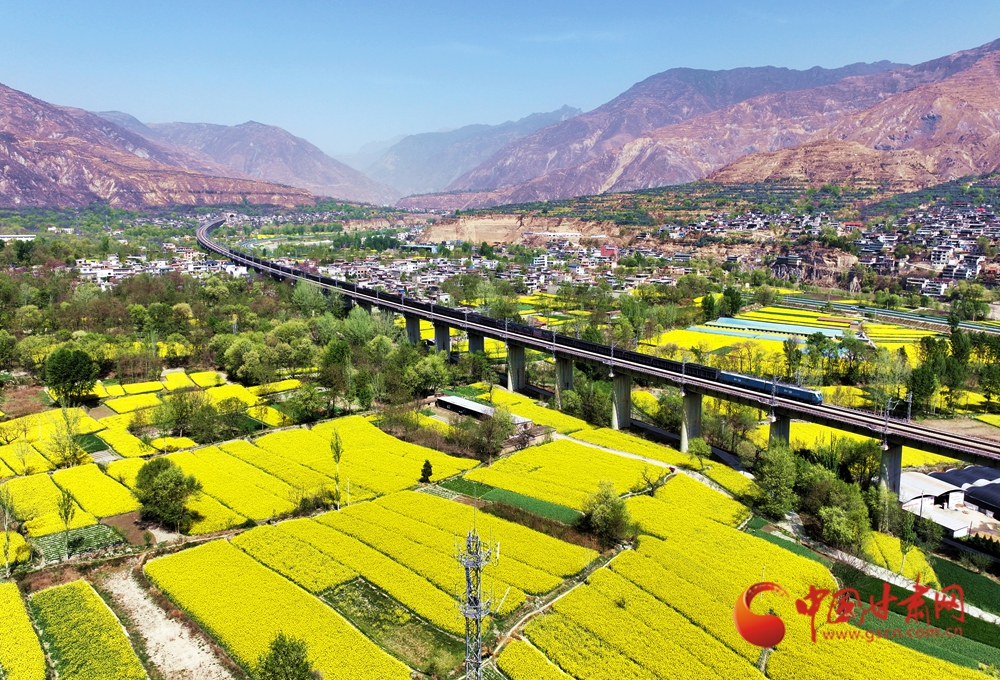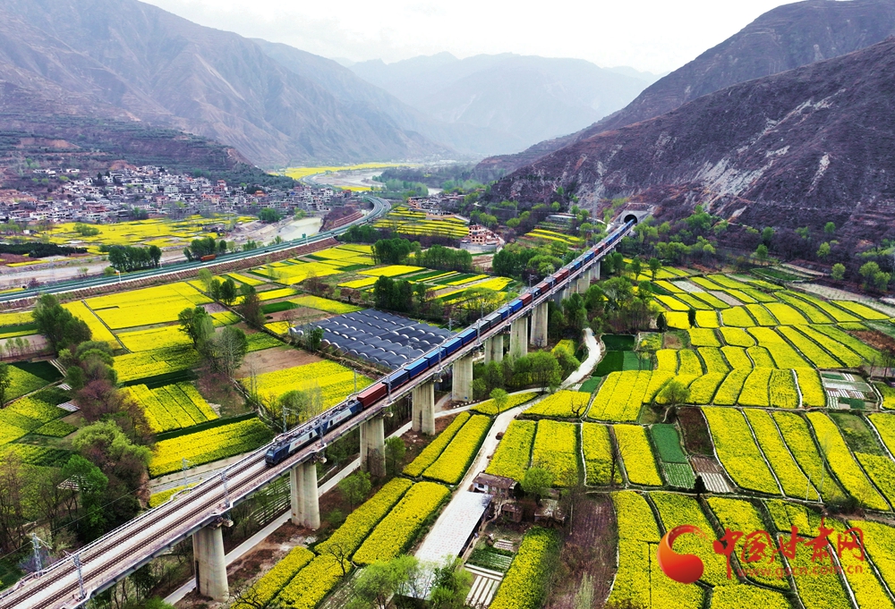 4月10日,列車在蘭渝鐵路宕昌縣沙灣鎮(zhèn)段附近行駛,穿行于花海之間?,F(xiàn)代交通動(dòng)脈與原始鄉(xiāng)野在此默契共生,火車轟隆駛過(guò),為春日畫卷增添了別樣的景致。