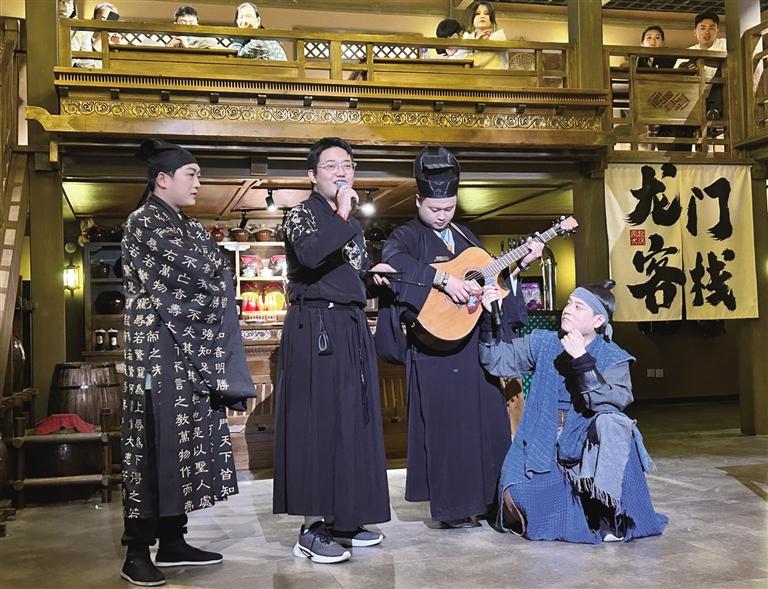 “諸位小友近來可好?”“好!”在街區(qū),NPC們與游客的互動(dòng)成為一大亮點(diǎn)。為了讓游客更好地沉浸其中,街區(qū)里的“蘭裳閣”專門提供服裝出租和妝造設(shè)計(jì)服務(wù)。游客們?cè)谶@里換上漢服、做好造型,“穿越”成古人與NPC們共同沉浸在這場(chǎng)歷史旅行中。張偉彥在“龍門客棧”工作快半年了,飾演店小二馬一刀。他對(duì)角色有著自己的理解:“導(dǎo)演讓我演店小二,大家印象里店小二都是機(jī)靈、腿腳快的。但我演的這個(gè)店小二帶著江湖氣息,他藏在龍門客棧,其實(shí)是個(gè)刀客,在這里打工是為了打探消息,畢竟龍門客??墒墙⒌木奂?。”記者走在街區(qū),時(shí)不時(shí)就能看到他拿著草帽,熱情地招呼游客玩接帽子游戲。遇到靦腆不敢嘗試的游客,他也會(huì)不斷鼓勵(lì),有時(shí)候碰上外國游客,他還隨口說幾句英語與其互動(dòng)。