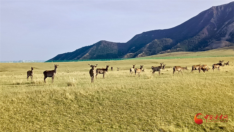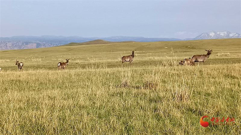 初夏的肅南大河草原牧草逐漸返青,一群群馬鹿在草原上悠閑覓食,游客到來并沒有打擾它們的正?;顒?dòng)。