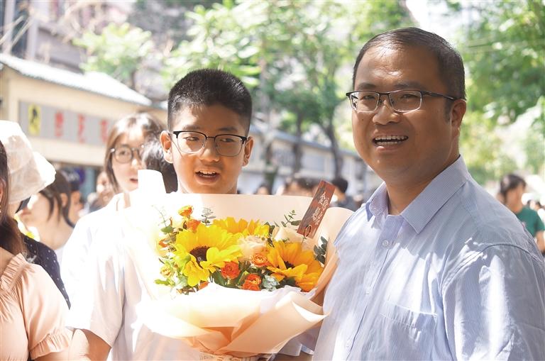 花束也是祝福的首選,“一舉奪魁”的向日葵更是家長們的最愛。在各考點(diǎn)附近的鮮花店里,以向日葵為核心的花束賣得格外好。首科的語文考試結(jié)束后,考生們最先收到的就是鮮花,還有媽媽的擁抱。