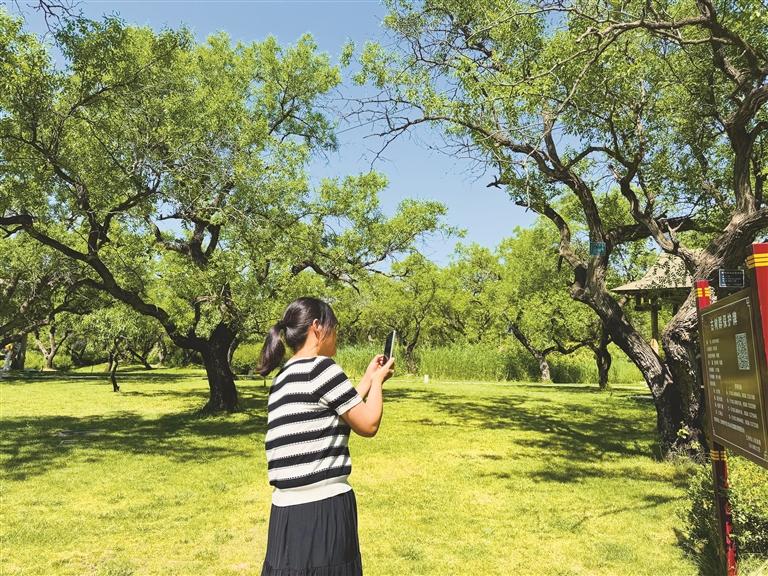 市民在仁壽山古棗樹群內掃碼查看古棗樹群詳細信息