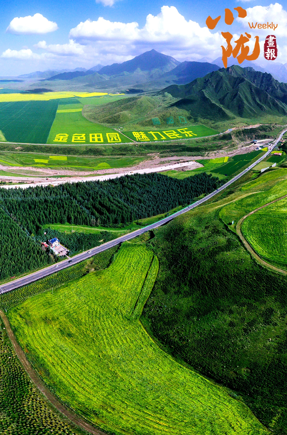 廣袤無(wú)邊的田野生機(jī)盎然,金黃色的油菜花夾雜著一塊塊碧綠色的麥田,好像給大地鋪上了一層五顏六色的大地毯。漂亮的民居鑲嵌其中,與祁連山相互輝映,在陽(yáng)光下美麗極了!