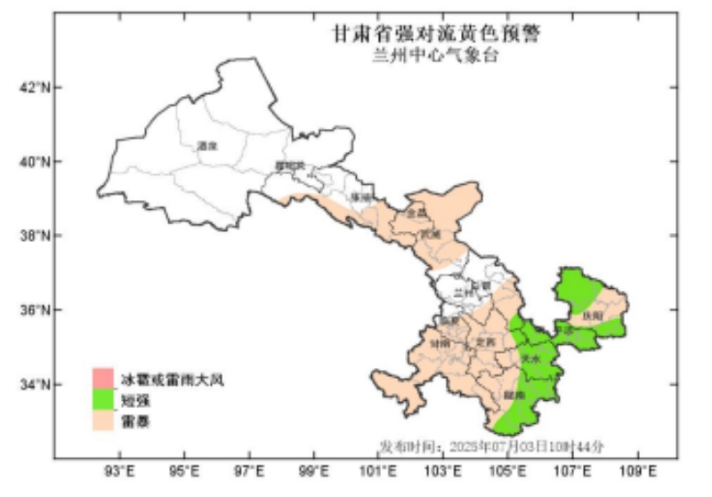 蘭州中心氣象臺2025年7月3日10時44分繼續(xù)發(fā)布強對流黃色預警:預計未來24小時,張掖、金昌、武威、蘭州、白銀、甘南、臨夏、定西、隴南、天水、平?jīng)?、慶陽等州市有雷暴,其中隴南、天水、平?jīng)觥c陽等市部分地方及白銀、定西兩市局部地方有短時強降水,最大小時雨強20-60mm;隴南、天水、平?jīng)?、慶陽等市強降水在未來24小時內(nèi)多發(fā),白銀、定西主要強降水時段在4日2-8時。請注意防范!