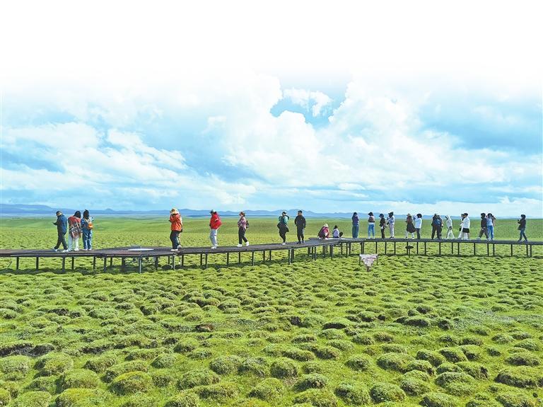 甘津文旅資源對接考察團成員在甘南天池冶海北岸拍照。