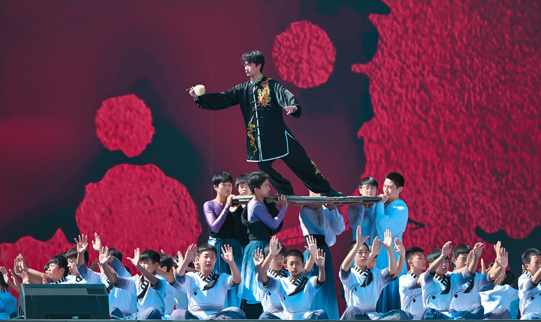 活動伊始,開場片《歡迎乘坐崆峒號》以“環(huán)西部火車游·崆峒號”平涼旅游專列為靈感,通過跨時空對話串聯崆峒山古今脈絡,拉開活動序幕?,F場,街舞與崆峒武術團體合作的《武韻崆峒》展現武術與現代肢體藝術新生機;笛子演奏與武術冠軍聯袂呈現的《崆音劍影》打造“可聽的武術”沉浸式體驗;30人陣容的江蘇武協(xié)女子太極拳團體演繹《鶴起崆峒》,詮釋武術新功用;國風歌手與秦腔表演藝術家合作的《秦韻長歌》,展現“武戲同源”的多元魅力。
