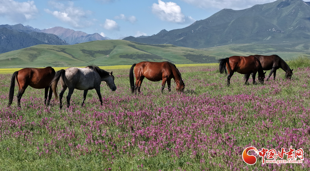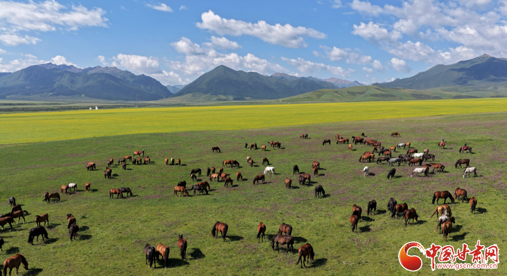 8月12日,在張掖山丹馬場,一場駿馬奔騰的壯闊景象震撼上演。藍天如洗,白云似絮,遠處連綿的山巒勾勒出雄渾的天際線,腳下黃綠交織的草原如巨幅織錦般鋪展。成群棕白相間的駿馬,似靈動音符躍動于綠野,騎手身姿矯健,與奔騰的馬群、遼闊的天地渾然一體,盡顯草原的壯美景象。