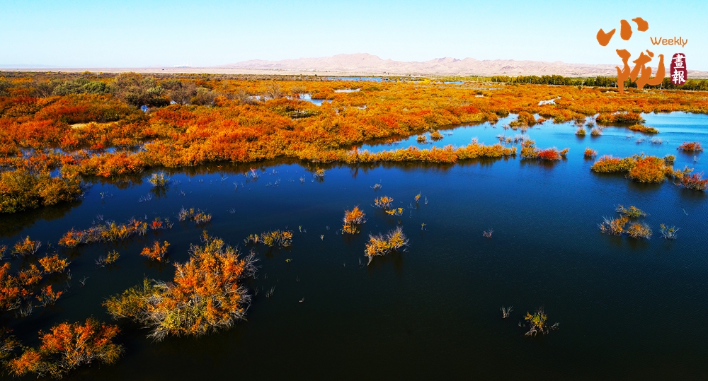 天藍(lán)藍(lán),水藍(lán)藍(lán),水天一色。紅柳簇?fù)沓裳?,燃燒在水中央,顯得格外奪目,展現(xiàn)出荒漠特有的壯美與生機(jī)。