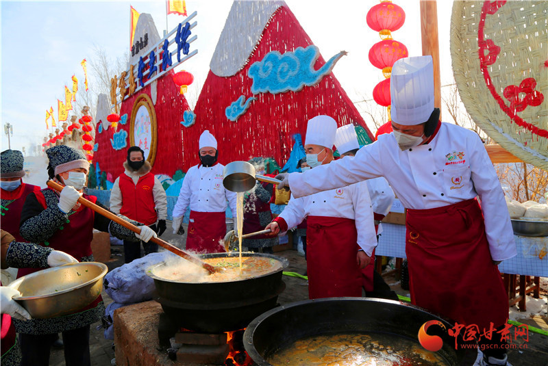 不必等炊煙裊裊的清晨,冬至日的祁店村從凌晨便沸騰起來。村頭的文化廣場上,八十口直徑逾一米的大鐵鍋一字排開,灶火熊熊燒得正旺,火苗舔舐著鍋底,將牛骨湯煮得咕嘟作響,濃郁的香氣裹著水汽,在半空中凝成一片白霧。案板前,數(shù)十位身著圍裙的“面嫂”巧手翻飛,揪面、摁花、搓形,一個個圓潤飽滿、帶著木梳紋路的“牛娃子”不斷滾落,轉(zhuǎn)眼便堆成了小山。來自天南海北的游客與本地村民摩肩接踵,有的挽起袖子加入制作的行列,有的踮著腳尖張望鍋里的動靜,還有的舉著手機直播這場盛事。當?shù)谝诲伵M拮语堉蠛?,工作人員用大鐵勺盛起,分送到等候已久的人們手中,廣場上頓時響起此起彼伏的吸溜聲與贊嘆聲。八萬人圍鍋而坐,大碗盛飯、大口喝湯,凜冽的寒風里,一碗熱飯下肚,渾身都暖透了,這便是山丹獨有的“萬人同吃牛娃子飯”的熱鬧圖景。