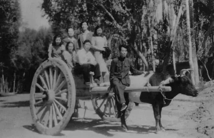 孫儒僴(前排右二)與同事們坐在牛車上(資料照片)。受訪者供圖