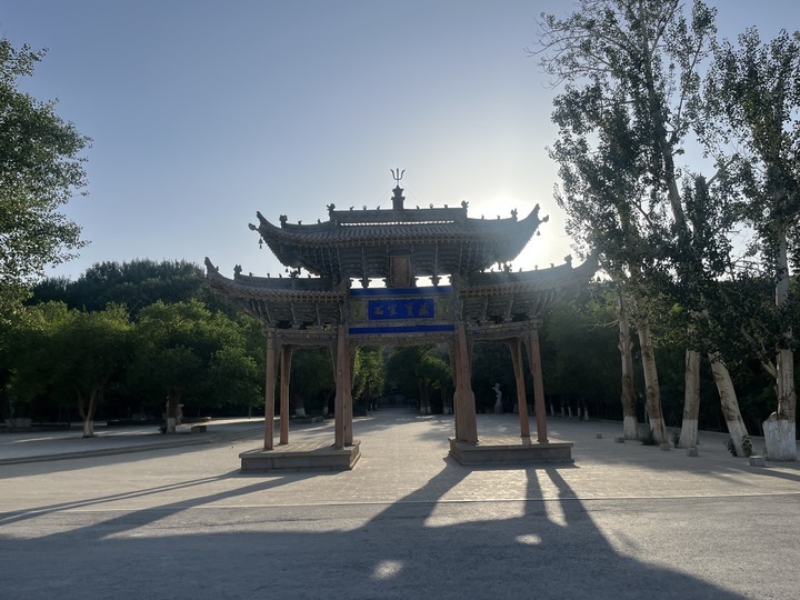 大牌坊是莫高窟另一處標(biāo)志性景觀。要進(jìn)入莫高窟窟區(qū),首先得經(jīng)過這座莊重質(zhì)樸、飛檐翹角的牌坊。牌坊匾額東面是“石室寶藏”,西面是“三危攬勝”,夕陽西下時(shí),更顯古韻。
