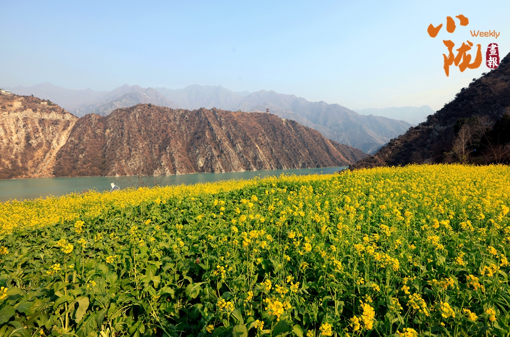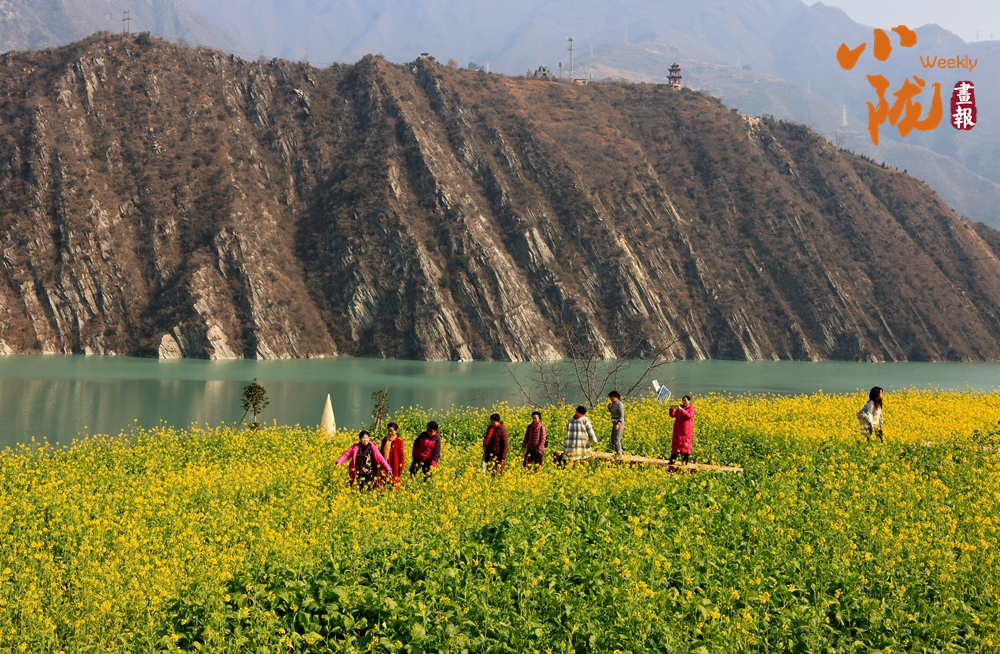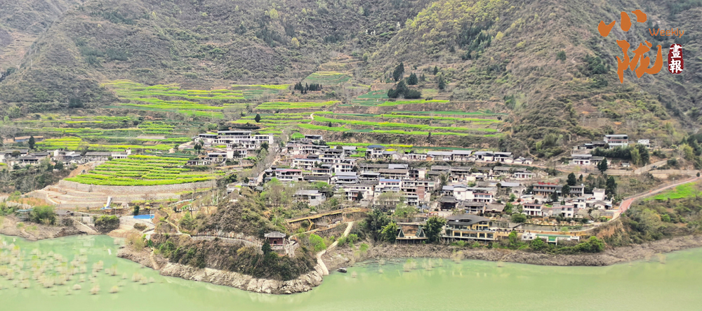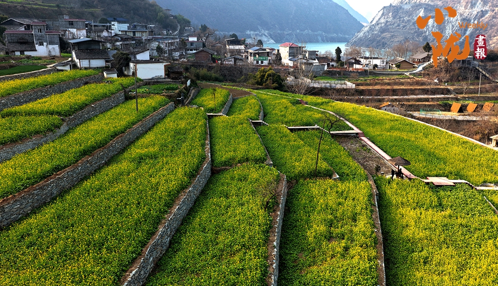 那一叢叢、一簇簇的油菜花,沿著梯田層層疊疊,從江邊一直蔓延到半山腰,鋪展在青山碧水之間;又像是大地剛剛蘇醒時,打翻的調色盤。