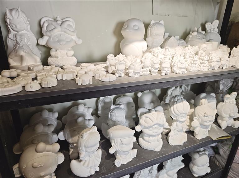 價格方面,店內(nèi)走親民路線。石膏彩繪體驗分為三個檔位,對應不同大小的白坯模型。面對在款式間猶豫的顧客,工作人員耐心介紹:“小的是9.9元,稍微大一點的19.9元,再大一些的29.9元。趕時間的話,選小一點的,完成得快,也不耽誤后續(xù)安排。”