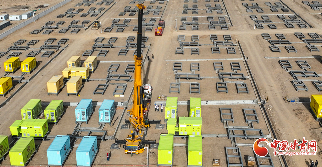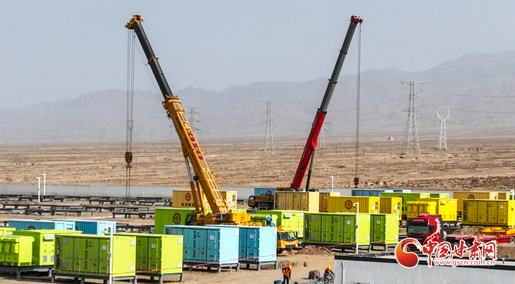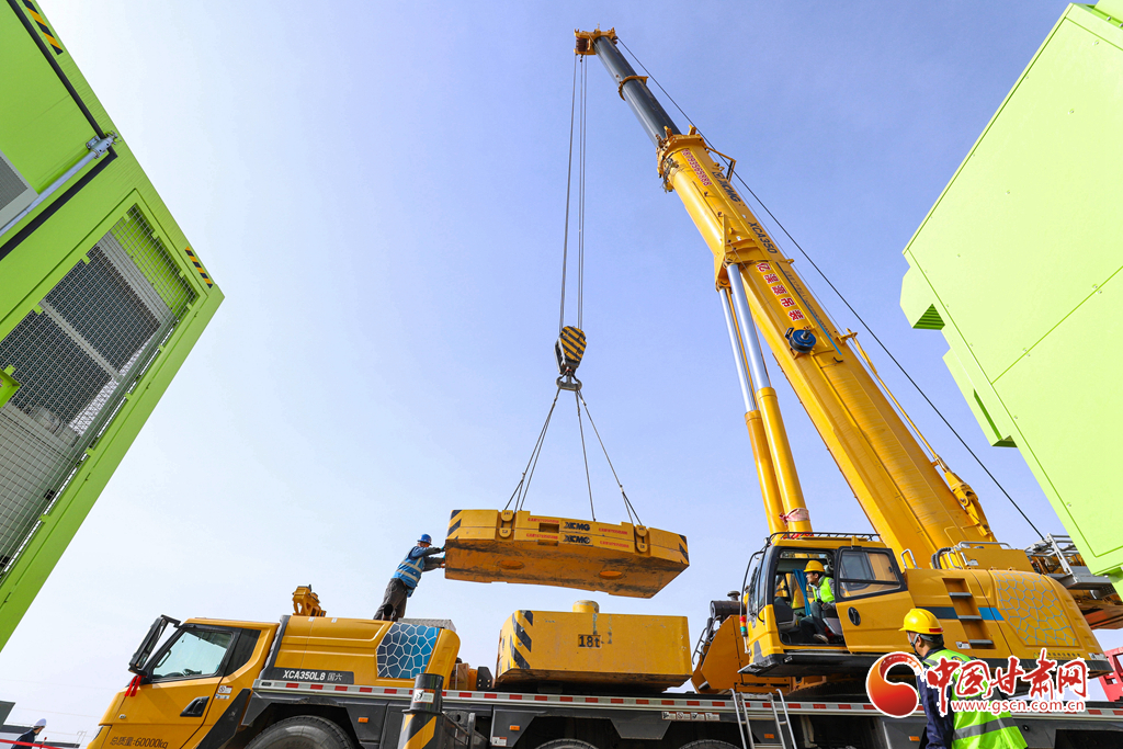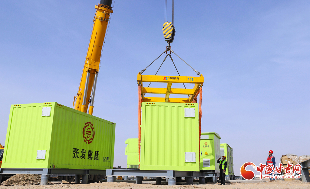 3月19日,張掖市山丹縣東樂灘上,工程建設(shè)者們正在進行儲能電站項目電池倉吊裝前的準(zhǔn)備。