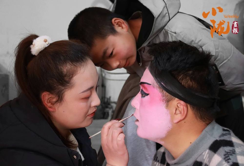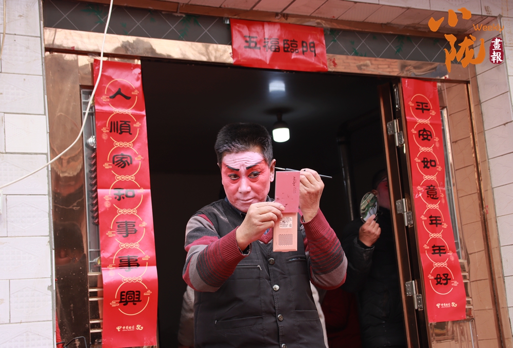 貼著紅春聯(lián)的屋門口,一位畫著戲曲臉譜的演員正對著手機調(diào)整妝容。這充滿鄉(xiāng)土氣息的戲曲準備場景,滿是民間年俗里熱鬧又質(zhì)樸的煙火氣,也藏著傳統(tǒng)藝術(shù)在鄉(xiāng)土間的鮮活傳承。